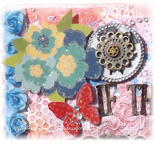 Here are some of the flower stickers from the kit that I used popped them up and glittered them. Then, I tucked a clock from the Prima Wood Icons in a Box – Typewriters & Clocksand and some Prima Vintage finds metals.